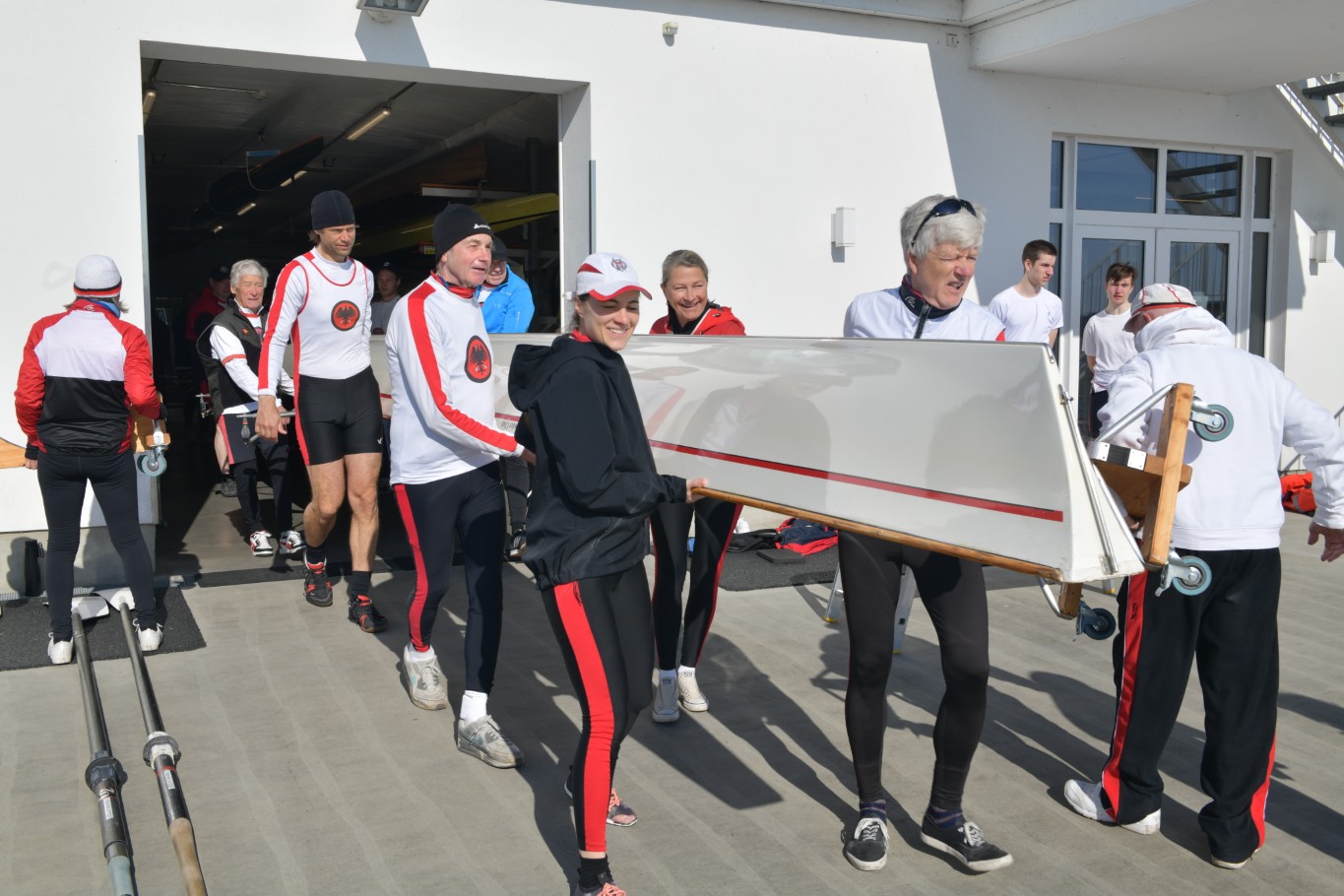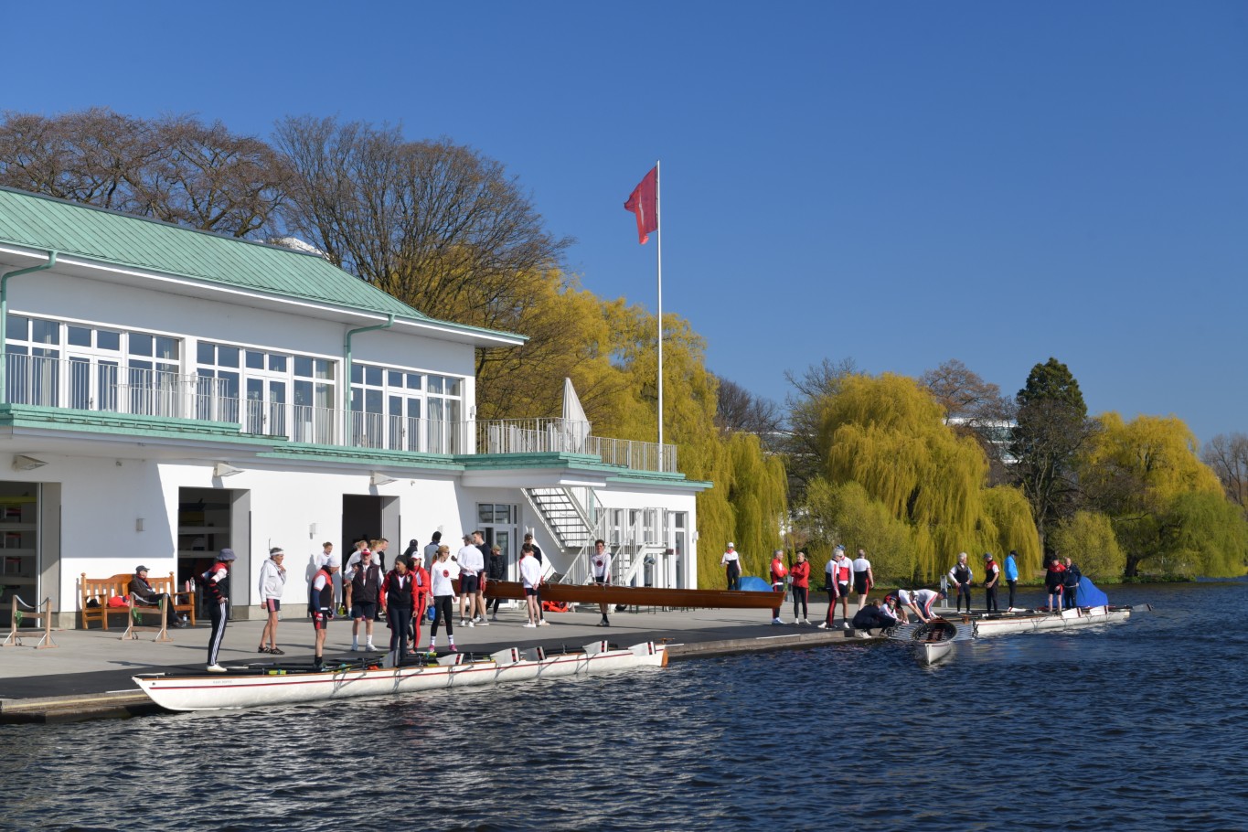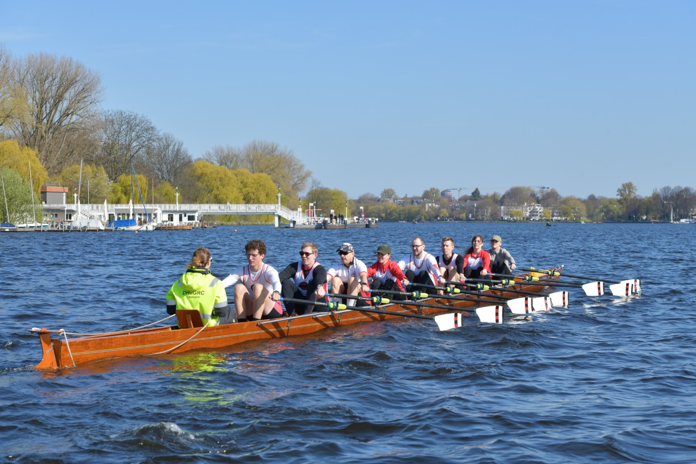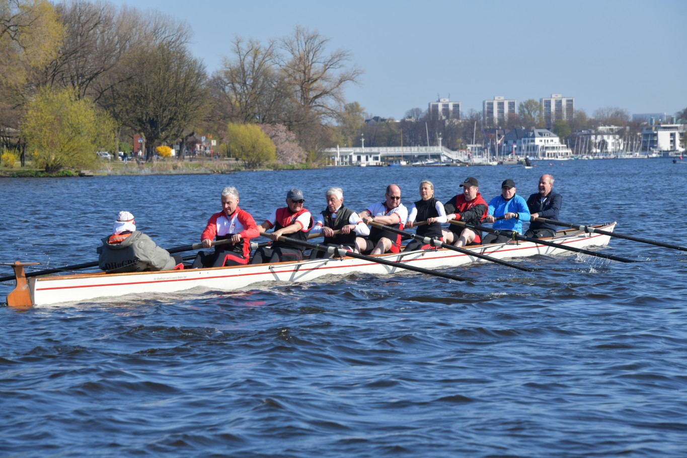 Wenn die Rudersportlerinnen und Rudersportler im Club im Frühjahr zum Anrudern zusammenkommen, ist die aktuelle Saison eigentlich schon voll im Gange. Dass sich diese traditionelle Veranstaltung trotzdem so guten Zuspruchs erfreut, das liegt daran, dass der für die Veranstaltung verantwortliche Kapitän für Sport, das ist in diesem Jahr erstmals Marc Kammann, auf dem Steg traditionell bunt zusammengewürfelte Rudergruppen zusammenstellt. So finden sich jung und alt, Breiten- und Leistungssportler, einmal unversehens zusammen in demselben Boot. Schon das (ebenfalls traditionelle) Gruppenfoto der Clubfamilie fand diesmal bei prallem Sonnenschein statt. Anschließend zögerte Marc nicht lange und sandte die Rudergruppen Richtung Teichwiesen. So entgingen die Mannschaften dem aktuell noch recht kalten Ostwind auf der Außenalster und konnten ein bisschen Frühlingssonne tanken.