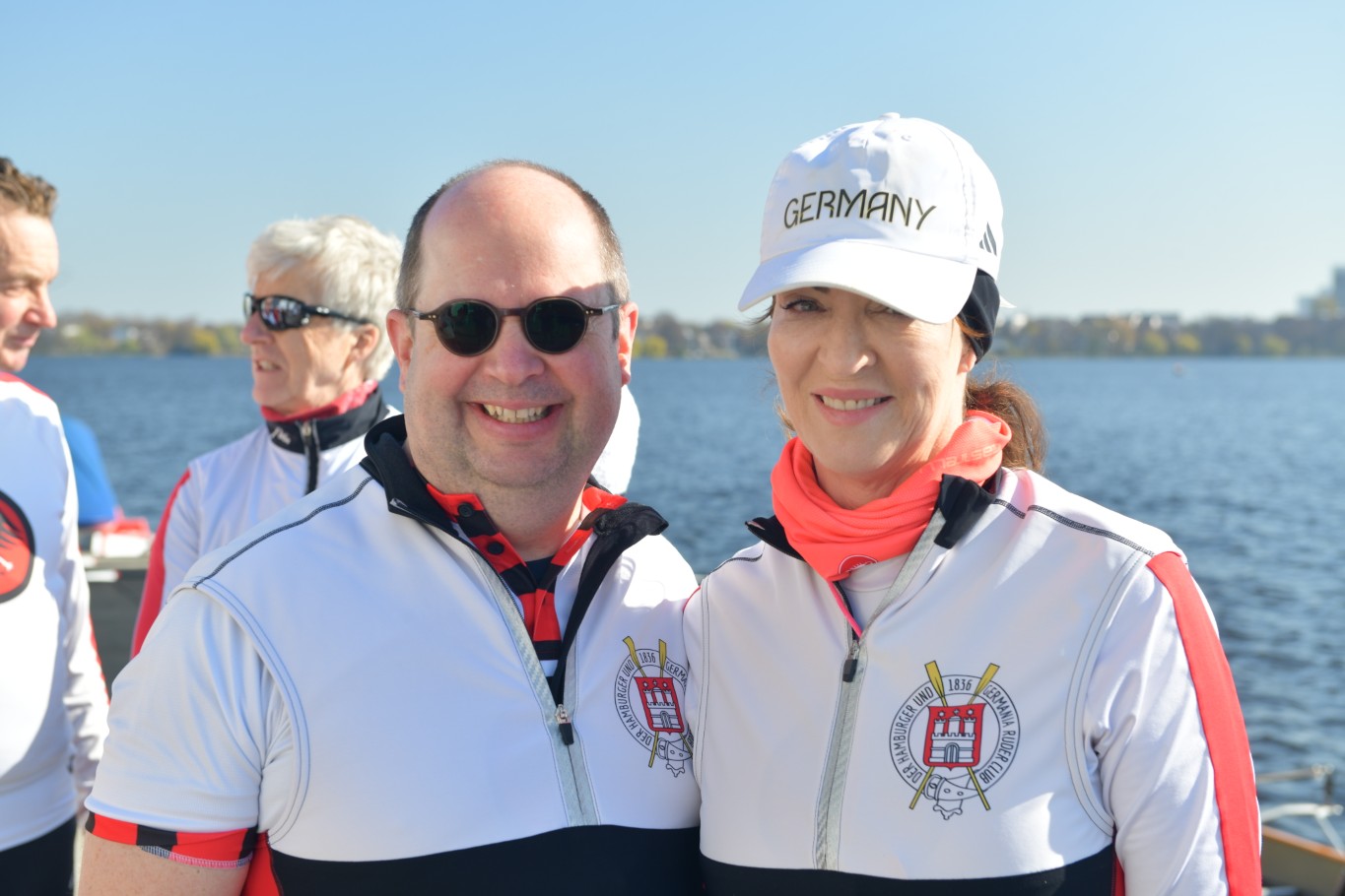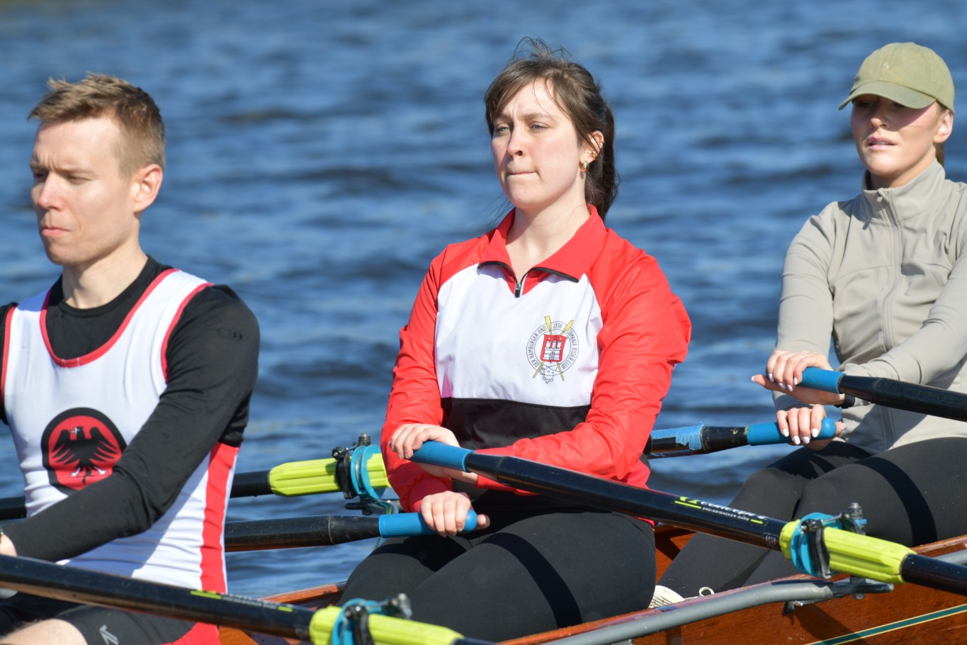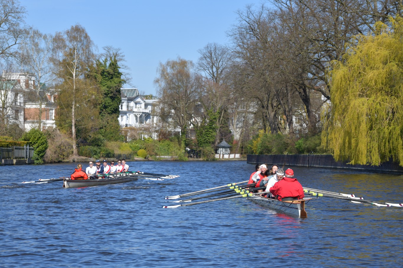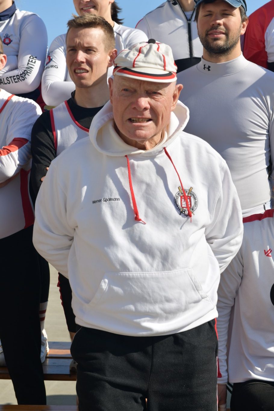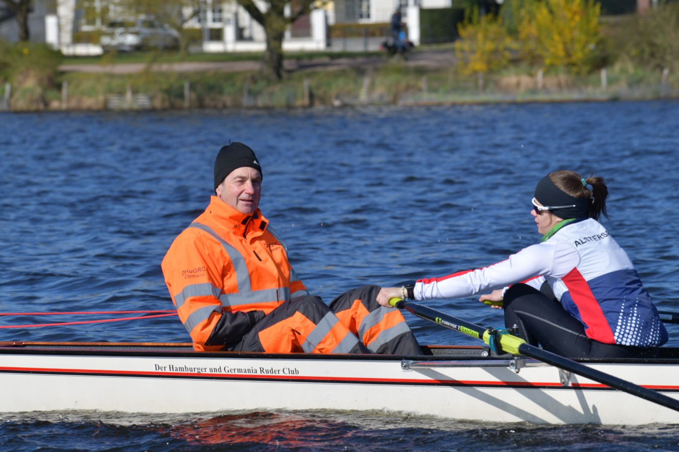 Wenn die Rudersportlerinnen und Rudersportler im Club im Frühjahr zum Anrudern zusammenkommen, ist die aktuelle Saison eigentlich schon voll im Gange. Dass sich diese traditionelle Veranstaltung trotzdem so guten Zuspruchs erfreut, das liegt daran, dass der für die Veranstaltung verantwortliche Kapitän für Sport, das ist in diesem Jahr erstmals Marc Kammann, auf dem Steg traditionell bunt zusammengewürfelte Rudergruppen zusammenstellt. So finden sich jung und alt, Breiten- und Leistungssportler, einmal unversehens zusammen in demselben Boot. Schon das (ebenfalls traditionelle) Gruppenfoto der Clubfamilie fand diesmal bei prallem Sonnenschein statt. Anschließend zögerte Marc nicht lange und sandte die Rudergruppen Richtung Teichwiesen. So entgingen die Mannschaften dem aktuell noch recht kalten Ostwind auf der Außenalster und konnten ein bisschen Frühlingssonne tanken.