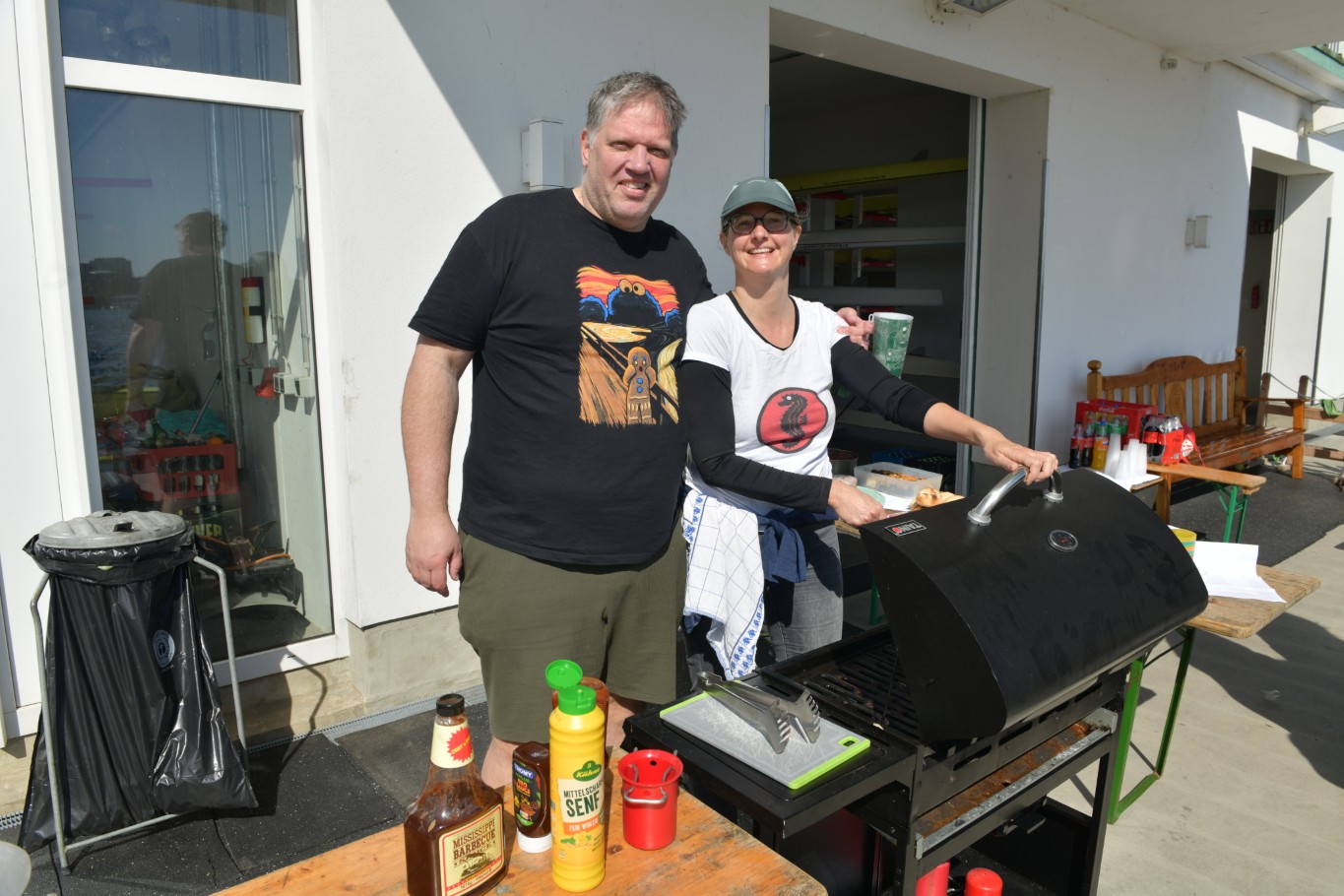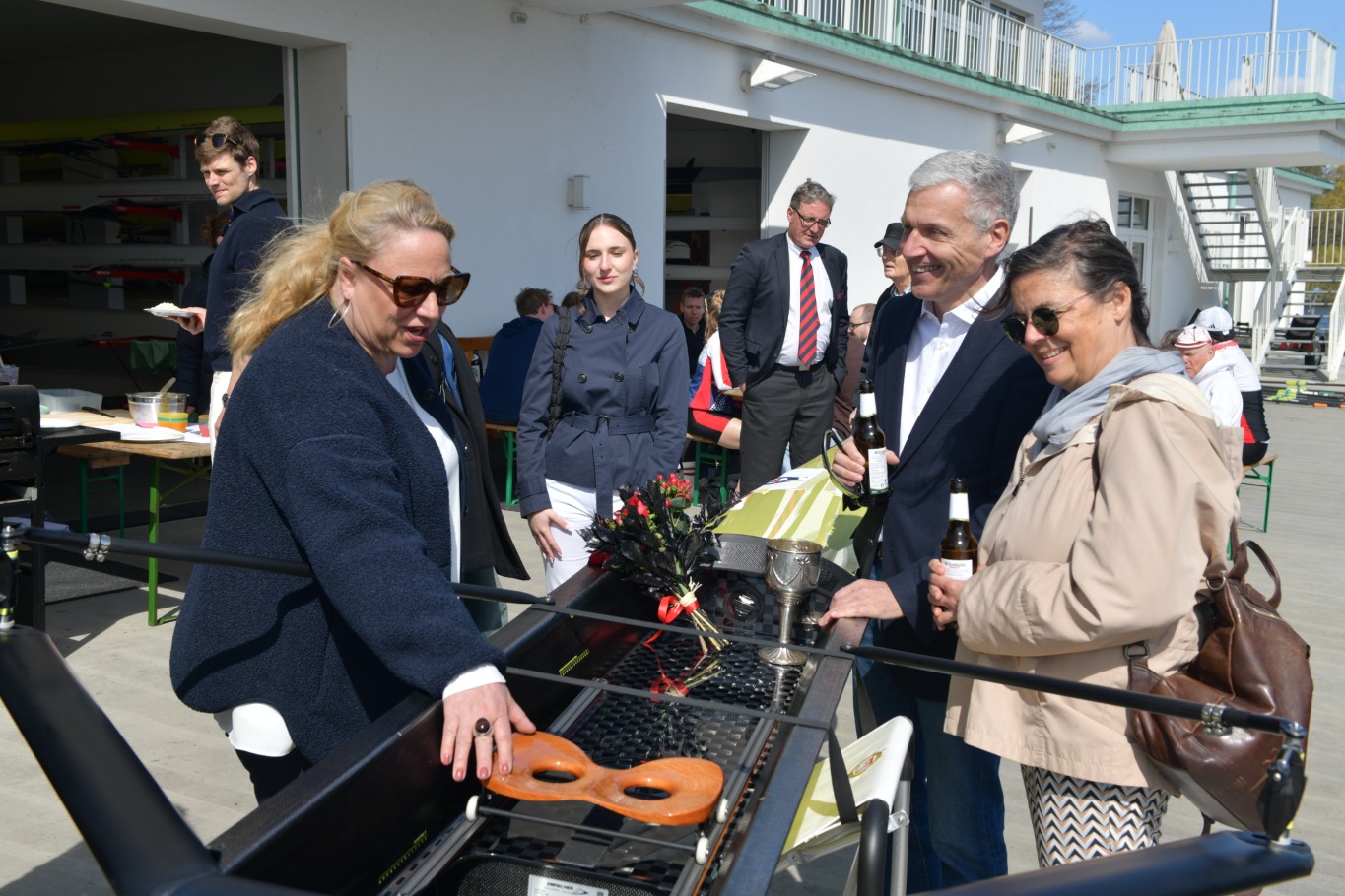 Während die Boote unterwegs waren, wurden auf dem Steg bereits Grill-Buffett und Biergarnituren aufgebaut. Zudem gab es einen Neuzugang im Bootspark zu begrüßen: Ein neuer leichter Doppelvierer aus dem Hause Empacher steht unseren Leistungssportlerinnen künftig zur Verfügung. Getauft wurde das Boot auf den Namen Dirk Schreyer im Andenken an den vor kurzem verstorbenen Rudersportler. Dirk Schreyer (28.07.1944–5.12.2025) war einer der erfolgreichsten Ruderer Deutschlands, Olympiagewinner und langjähriges Clubmitglied.