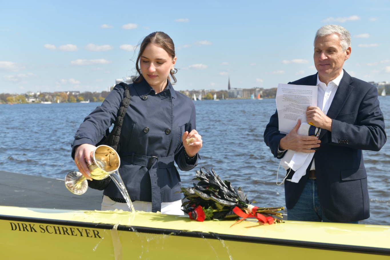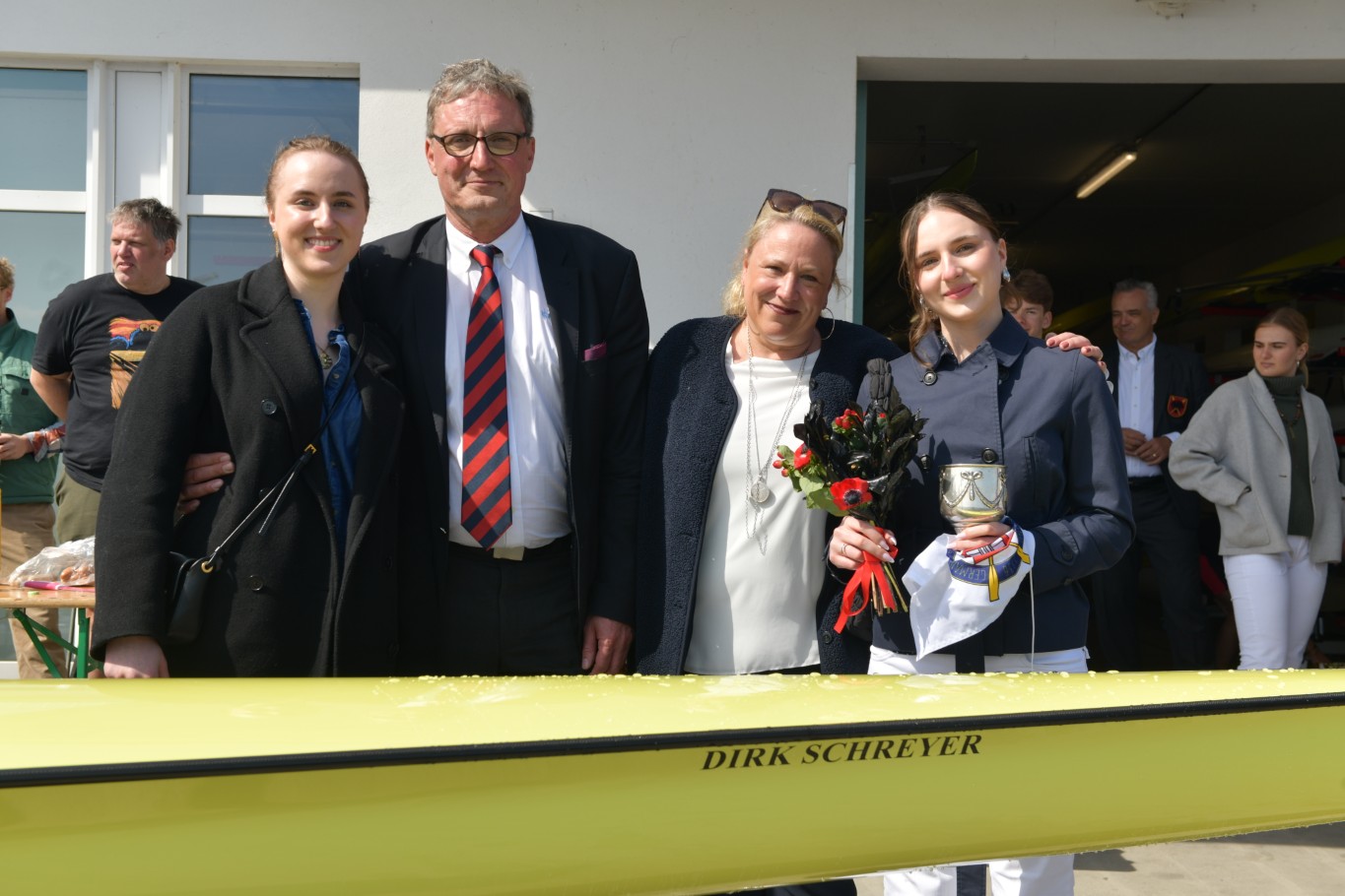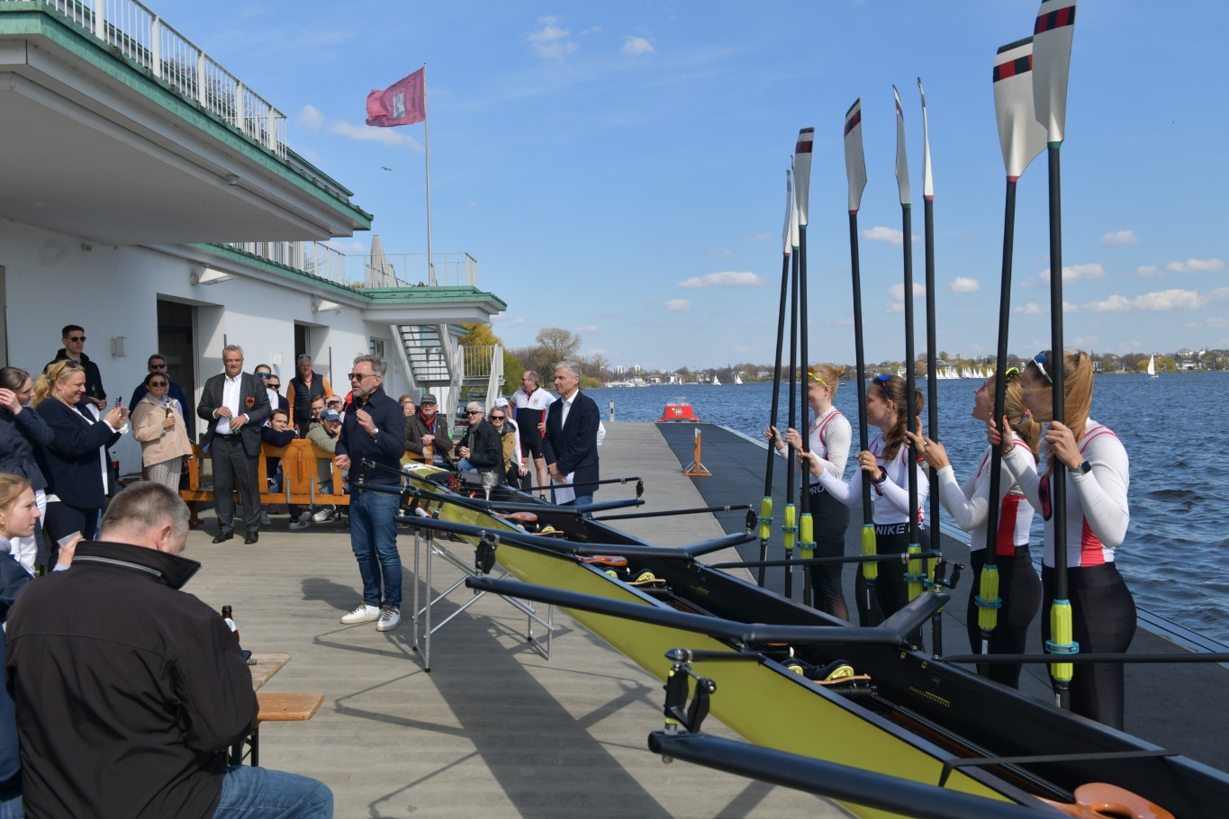 Die Taufansprache hielt Götz, als Vertreter der Club-Stiftung, die den Vierer gestiftet hat. Das gelbe Boot leuchtete in der Frühlingssonne, Maja, Helene, Sophia und Klara standen Spalier, ein großartiges Bild. Familie Schreyer war sichtlich gerührt und die Enkelin Katharina Schreyer taufte, traditionell mit einem alten Silberpokal gefüllt mit Alsterwasser, den Rennvierer. Mit großem Applaus und einem dreifachen „Hipp Hipp Hurra“ wurde das Boot begrüßt. Die vier Leistungssportlerinnen ließen den neuen Doppelvierer darauf zu Wasser und führten ihn bei einer ersten Vorbeifahrt dem Publikum vor. Bei Sonne, Grillwurst und Kuchen lud der Samstagnachmittag dann noch zum gemeinsamen Verweilen an der Alster ein.