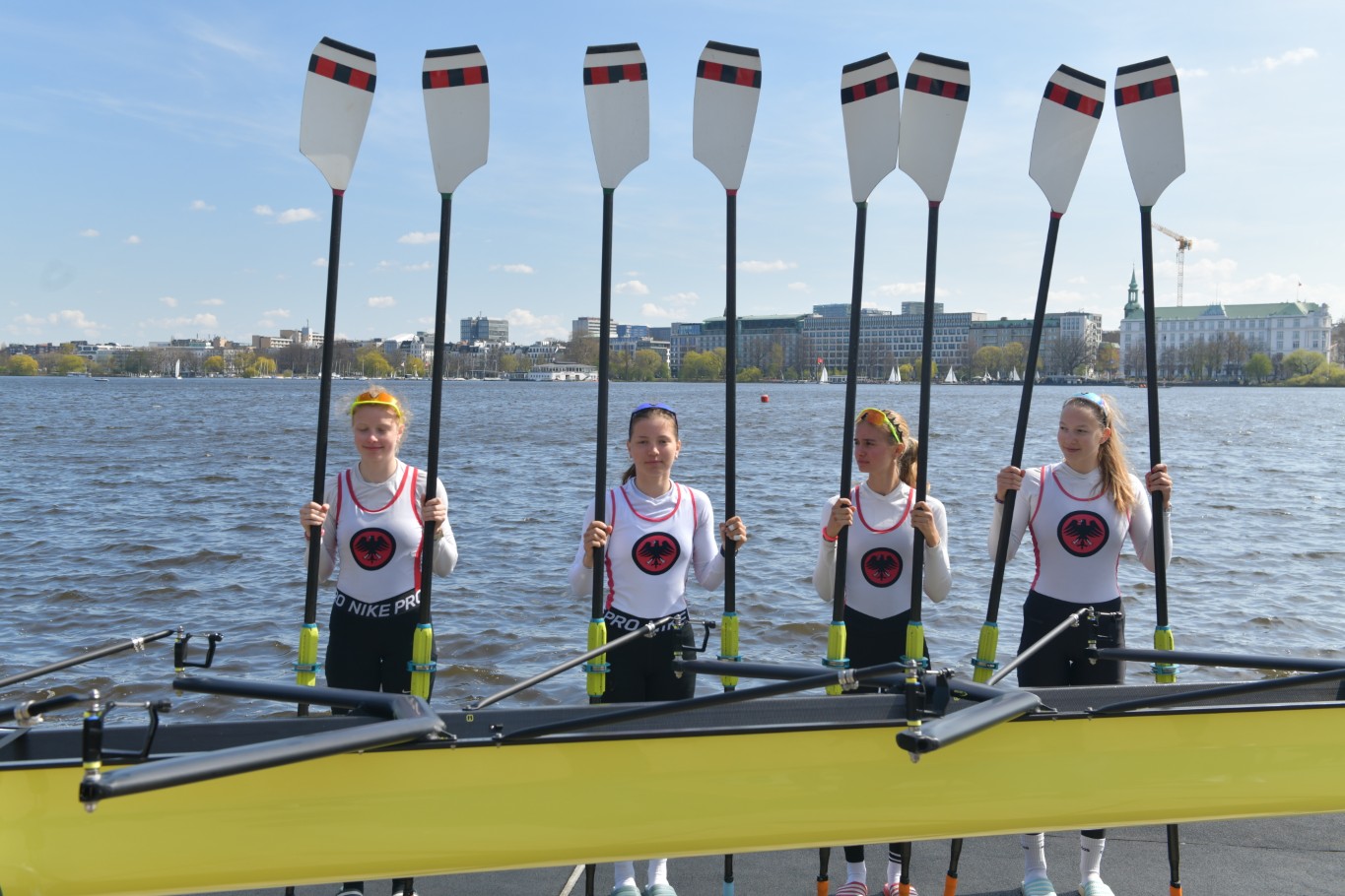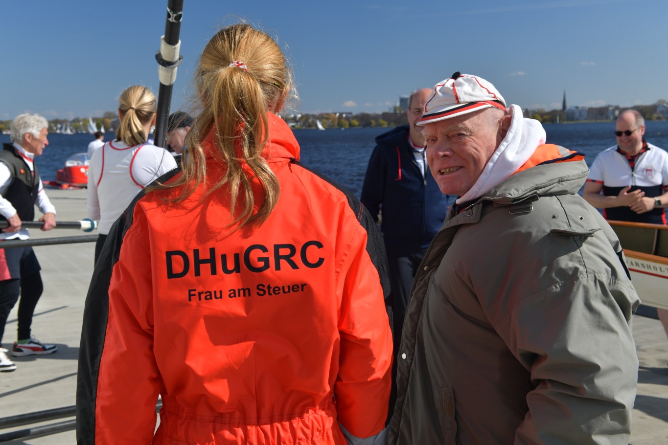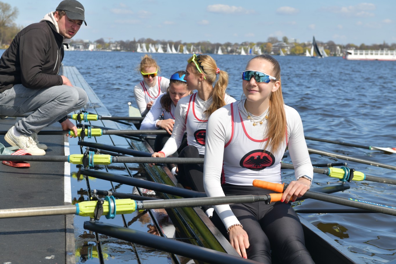 Die Taufansprache hielt Götz, als Vertreter der Club-Stiftung, die den Vierer gestiftet hat. Das gelbe Boot leuchtete in der Frühlingssonne, Maja, Helene, Sophia und Klara standen Spalier, ein großartiges Bild. Familie Schreyer war sichtlich gerührt und die Enkelin Katharina Schreyer taufte, traditionell mit einem alten Silberpokal gefüllt mit Alsterwasser, den Rennvierer. Mit großem Applaus und einem dreifachen „Hipp Hipp Hurra“ wurde das Boot begrüßt. Die vier Leistungssportlerinnen ließen den neuen Doppelvierer darauf zu Wasser und führten ihn bei einer ersten Vorbeifahrt dem Publikum vor. Bei Sonne, Grillwurst und Kuchen lud der Samstagnachmittag dann noch zum gemeinsamen Verweilen an der Alster ein.